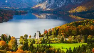 Lake Bohinj, is overlooked by towering mountains and its shore is hugged by deep green forests. The atmosphere is especially serene near the visitor center, where a stone bridge leads to the white church of St. John the Baptist. From the bridge you'll enjoy a stunning view of the lake. You can walk further along the shores, take a quick dip, rent a boat, or enjoy a scenic cruise on an electronic boat tour.