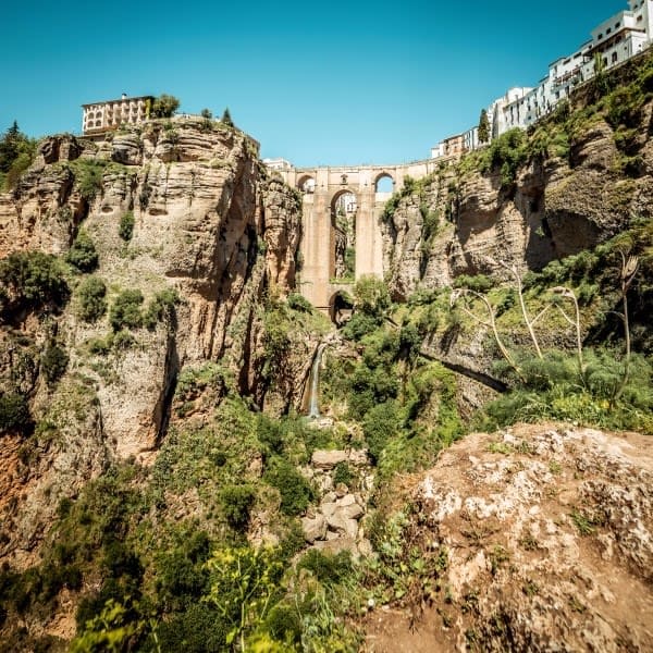 This vantage point offers a dramatic perspective of the 18th-century Puente Nuevo, soaring 320 feet (98m) above the El Tajo gorge, with the Guadalevín River cascading into a beautiful waterfall below. The combination of the bridge’s architectural grandeur, the rushing water, and the gorge’s rugged cliffs creates an unforgettable panorama.